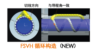 舊型式(FSVC)之循環方式為回流管垂直插入滾珠溝槽形成一前傾角,滾珠在進入回流管時會與回流管撞擊而彈入回流管,FSVH系列之循環構造由切線方向進入回流管,與導程角方向一致可順暢進入回流管,可提高循環構造之使用壽命。